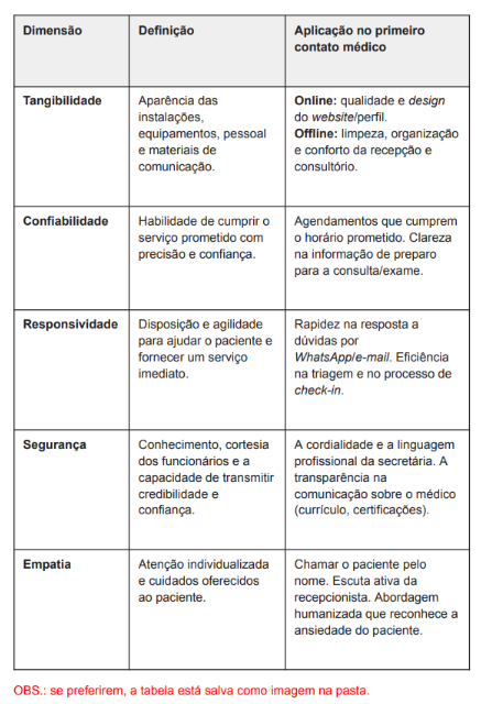 A excelência na primeira impressão pode ser analisada através das cinco dimensões da qualidade em serviços do modelo Servqual (Service Quality), adaptadas ao contexto médico (Parasuraman, Zeithaml & Berry):