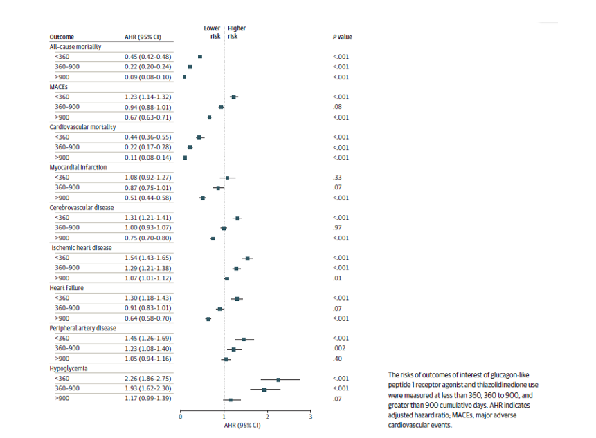 Na Figura 2 podemos observar que o uso prolongado da combinação de GLP-1RA e tiazolidinediona reduz progressivamente o risco de mortalidade e eventos cardiovasculares. O hazard ratio ajustado (AHR) para mortalidade por todas as causas caiu de 0,45 (IC95%, 0,42–0,48) com menos de 360 dias de uso para 0,09 (IC95%, 0,08–0,10) após mais de 900 dias. A mortalidade cardiovascular reduziu de 0,44 (IC95%, 0,36–0,55) para 0,11 (IC95%, 0,08–0,14), e os MACEs de 1,23 (IC95%, 1,14–1,32) para 0,67 (IC95%, 0,63–0,71). O risco de hipoglicemia foi mais alto no início (AHR 2,26; IC95%, 1,86–2,75) e diminuiu com o tempo (AHR 1,17; IC95%, 0,99–1,39). Esses resultados indicam que o uso prolongado da combinação está associado a maiores benefícios cardiovasculares e menor risco de hipoglicemia ao longo do tempo.2