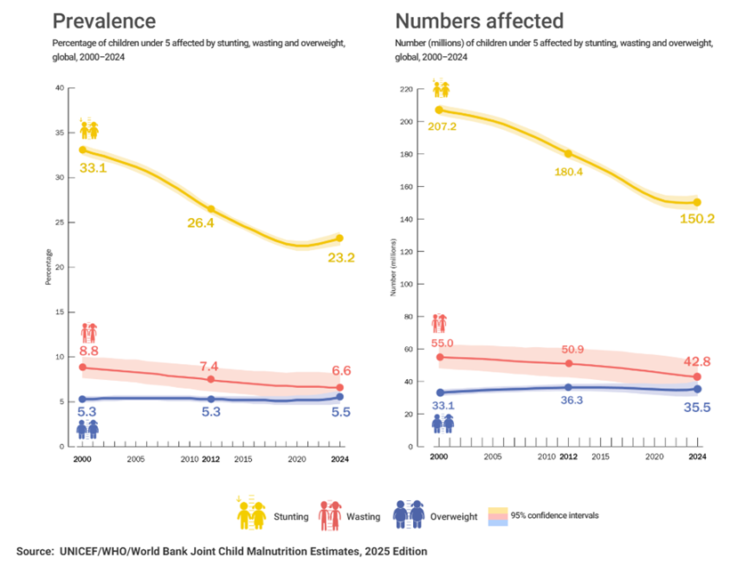 Figura 1:  Evolução da desnutrição e excesso de peso em crianças menores de 5 anos (2000–2024) - dados globais do UNICEF/WHO/World Bank Joint Child Malnutrition Estimates – 2025 Edition²