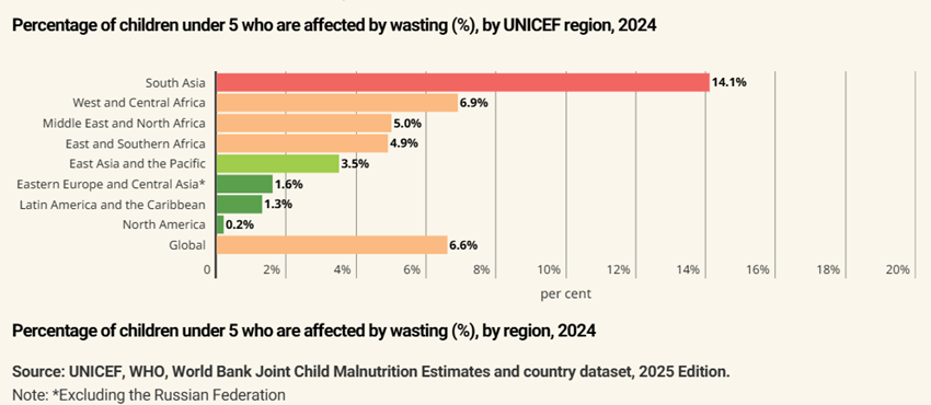 Figura 2: Prevalência de emaciação (wasting) em crianças menores de 5 anos por região, 2024 - dados do UNICEF, WHO, World Bank Joint Child Malnutrition Estimates – 2025 Edition²